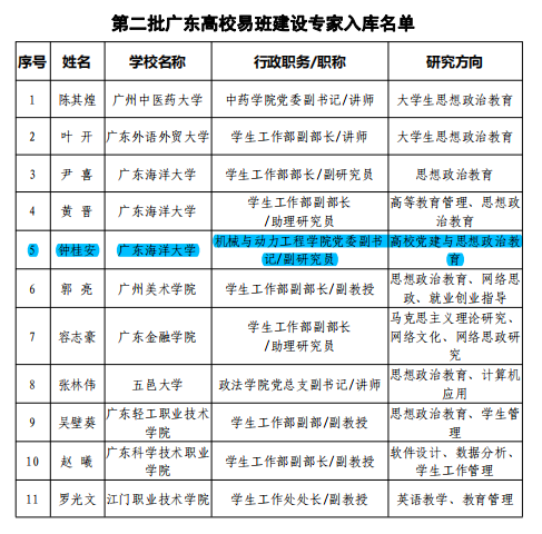 经全省各高校推荐、广东高校易班发展中心组织专家评审,在全省众多候选者中,机械与动力工程公司党委副书记、思想政治教育副研究员钟桂安老师获选为广东高校易班建设专家。