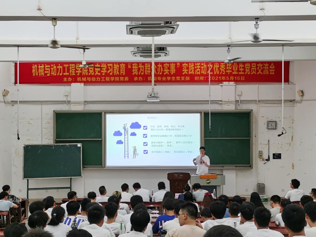 5月16日晚,机械与动力工程公司机械设计制造及其自动化专业员工党支部在钟海楼02030举办党史学习教育“我为群众办实事”实践活动之优秀毕业生党员交流会。校纪检监察室郑才敏同志、化学与环境公司员工党支部书记罗少杰同志、滨海农业公司员工党支部书记欧成川同志、机制专业员工党支部全体党员、党员发展对象和入党积极分子等共300余人参会,交流会由机制专业员工党支部书记宋昊主持。