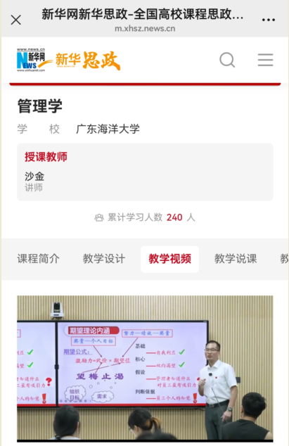 近日,永利集团304官网工业工程专业教师沙金负责的《管理学原理与方法》课程授课视频被新华网收录并发布,作为优质教学资源向全社会推广。